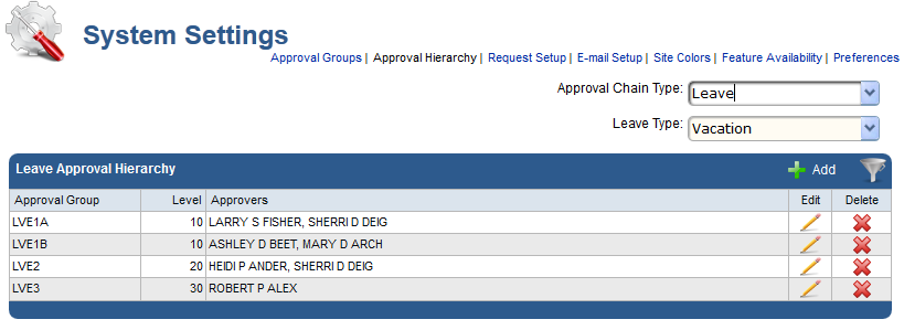 Following is an example of an approval hierarchy for employee vacation leave requests. In this example, the organization requires two approvers for the first level of approval for an employee vacation leave request, with two approval groups assigned to that level. The remaining levels require one approver per level to approve or deny the employee request.