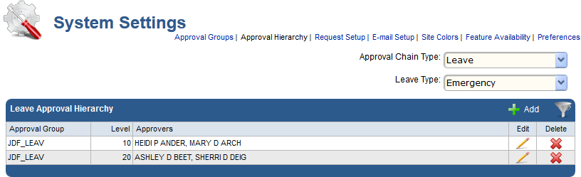 Following is an example of an approval hierarchy for employee leave requests. In this example, the organization requires two levels of approval for an employee leave request, with one approval group assigned to each level: